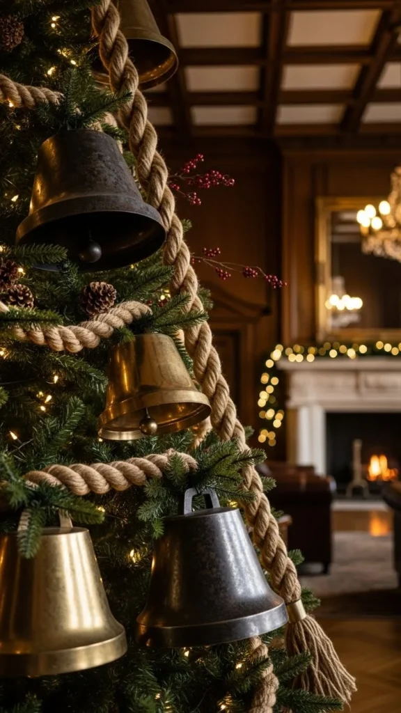 Metal bells bring sound and charm. Choose bells in bronze or aged metal for a rustic feel. Hang larger ones lower on the tree and smaller ones near the top. Keep other ornaments simple so the bells stand out. Add twine bows or rope garlands to keep the theme consistent. This idea works well in entryways or living rooms because the bells feel warm and festive.