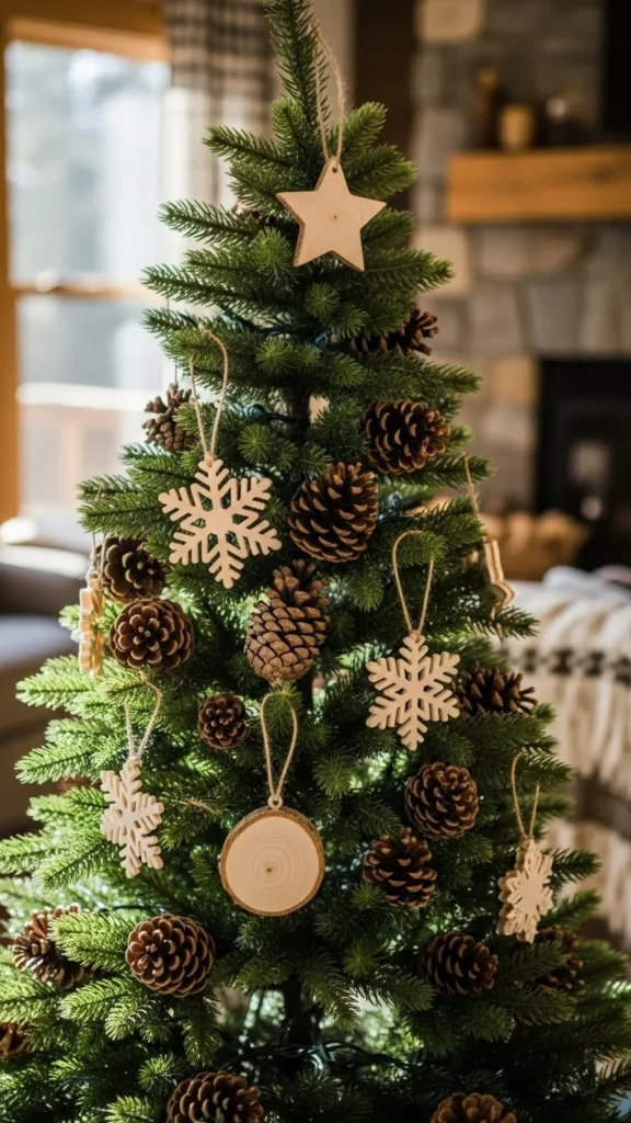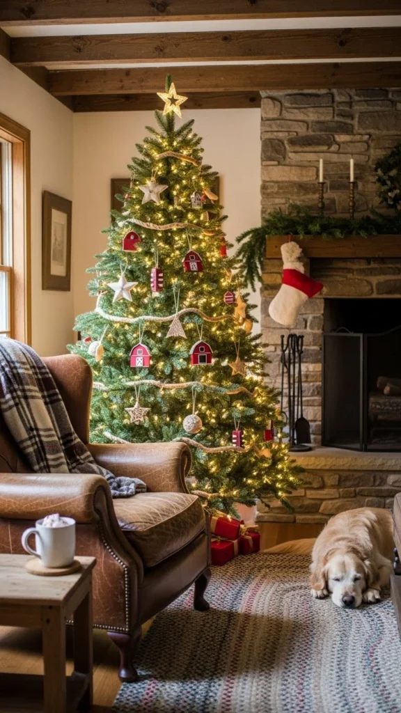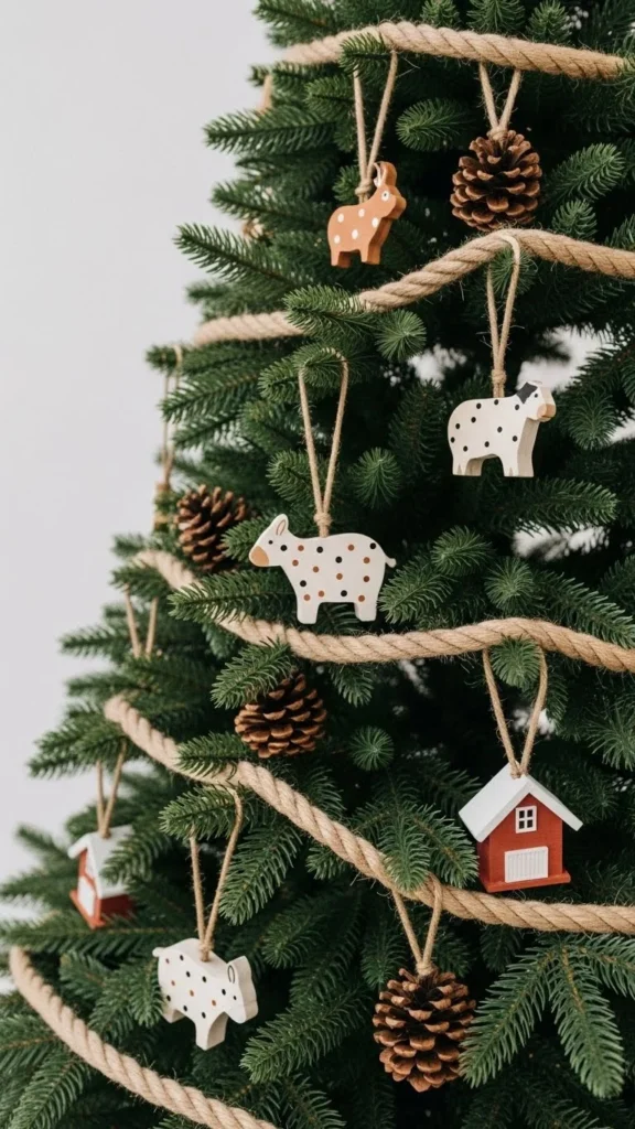 Farm animal ornaments add playfulness. Look for small wooden cows, sheep, or horses. Mix them with pinecones and wood stars. Use twine or rope to tie the theme together. This idea is especially good for families and cabins.