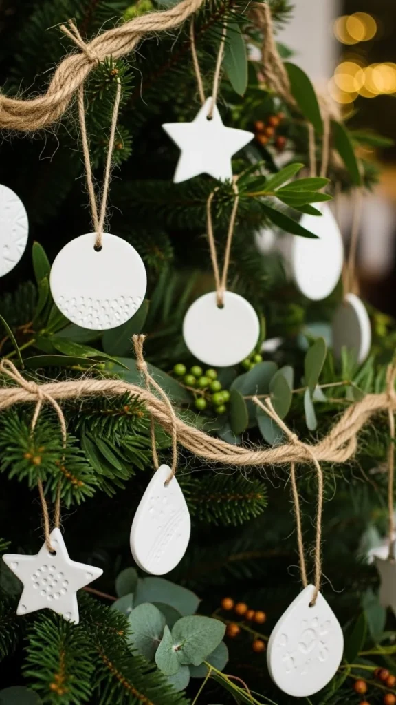 Air-dry clay is easy and cheap. Roll it out, cut shapes with cookie cutters, and let them dry. Add twine for hanging. Keep them white for a clean country look. Mix with wood ornaments and warm lights. The mix of textures feels soft and charming. This style suits minimal homes that want a bit of warmth.