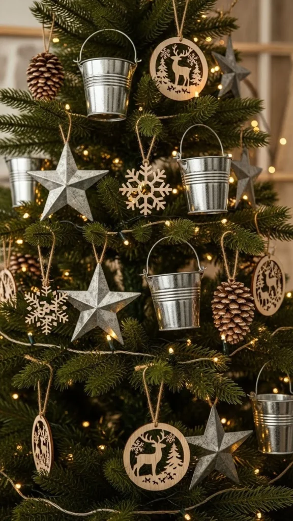 Small galvanized pieces create a farmhouse metal touch. Look for tiny buckets, metal stars, or tin ornaments. Combine these with natural wood pieces to keep the tree balanced. This style works well with muted colours like cream, grey, and brown. It gives your tree a farmhouse edge without feeling harsh.
