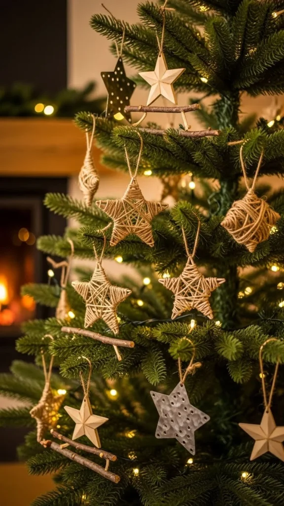 A star-themed tree feels simple and cohesive. Make your own stars using twigs tied with twine. Add wooden or metal stars for variety. Keep the colours neutral so the textures stand out. Warm lights complete the look. This style stays affordable and easy to recreate.