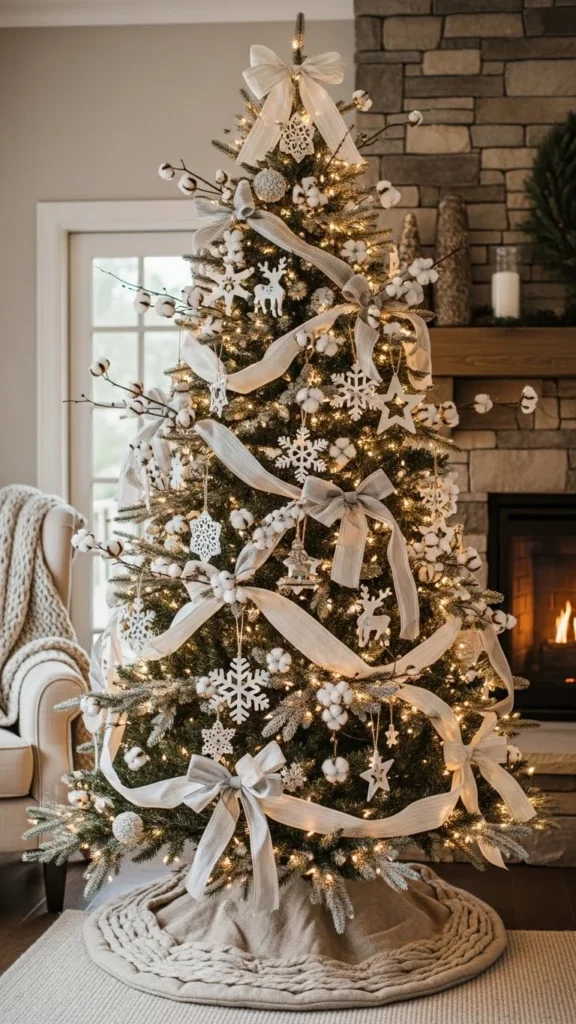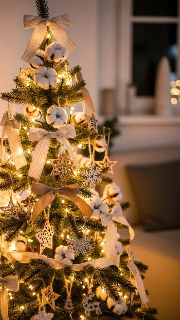 Cotton stems bring softness and warmth. Tuck them between branches to create a fluffy, cosy look. Add neutral ribbons like linen or muslin. Keep ornaments simple: wood circles, matte white baubles, or twine pieces. This gives your tree a peaceful farmhouse feel.