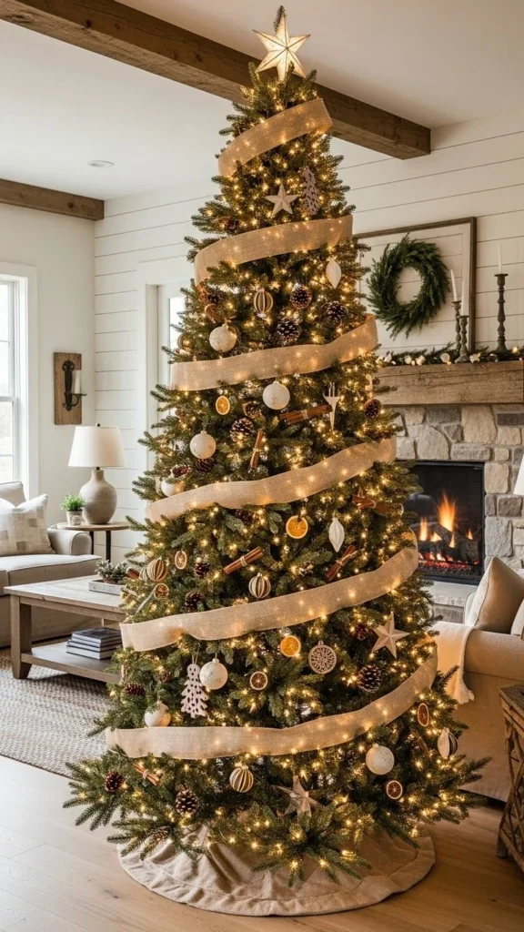 Burlap ribbon adds a soft country charm without much effort. Choose wide ribbon so it sits nicely on the branches. Instead of wrapping it tightly, tuck it in loose waves from top to bottom. This keeps the look relaxed. Pair it with wooden ornaments, tiny bells, or twig stars. For a personal touch, cut small burlap strips and tie them around a few branches like little bows. Use soft warm lights for a gentle glow. If your tree looks too plain, add a few sprigs of faux berries for colour. This idea works well if you’re decorating on a small budget because burlap is inexpensive and covers a lot of tree space. It creates a warm, inviting look with just a few simple steps.