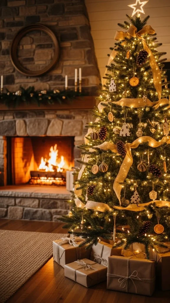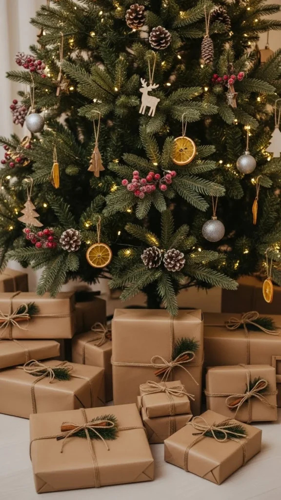 Matching the gifts to the tree helps complete the rustic style. Wrap gifts in kraft paper and tie with twine. Add dried orange slices or pine sprigs as accessories. Keep ornaments simple so everything feels connected. This idea keeps costs low and makes your tree look styled from top to bottom.