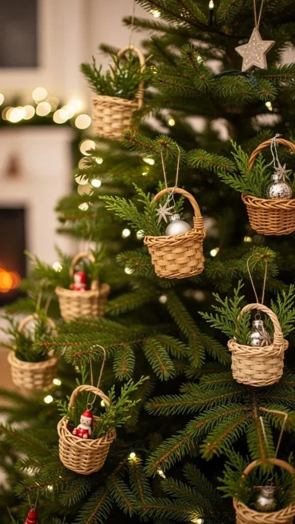 Mini baskets add texture and charm. Choose small woven pieces and fill them with pine sprigs or tiny baubles. Hang them with rope. Add wooden stars or bells for balance. This idea brings a handcrafted feel that suits any rustic theme.
