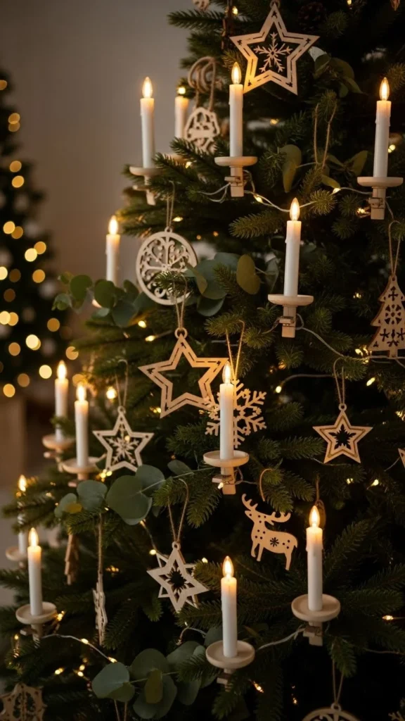 Candle-style lights give a warm, old-fashioned glow. Clip them evenly around the tree. Add wood ornaments and pine sprigs. Keep colours natural so the lights stand out. This idea brings a gentle charm that feels like a country Christmas evening.