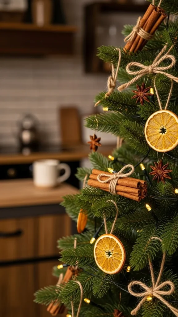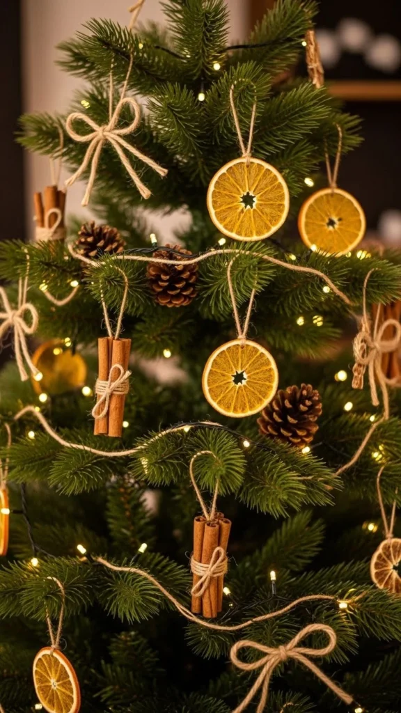 Dried oranges bring beautiful colour and a soft citrus scent. Slice the oranges thinly, pat them dry, and bake on low heat until they’re fully dehydrated. Thread twine through each slice for a natural hanger. Mix them with cinnamon sticks tied in small bundles. Add a few wood ornaments or plain baubles if you want more depth. The mix of orange and brown creates a warm country feel that suits farmhouse spaces or modern homes. This idea keeps costs low and adds something special without clutter. The tree will look warm, simple, and charming.