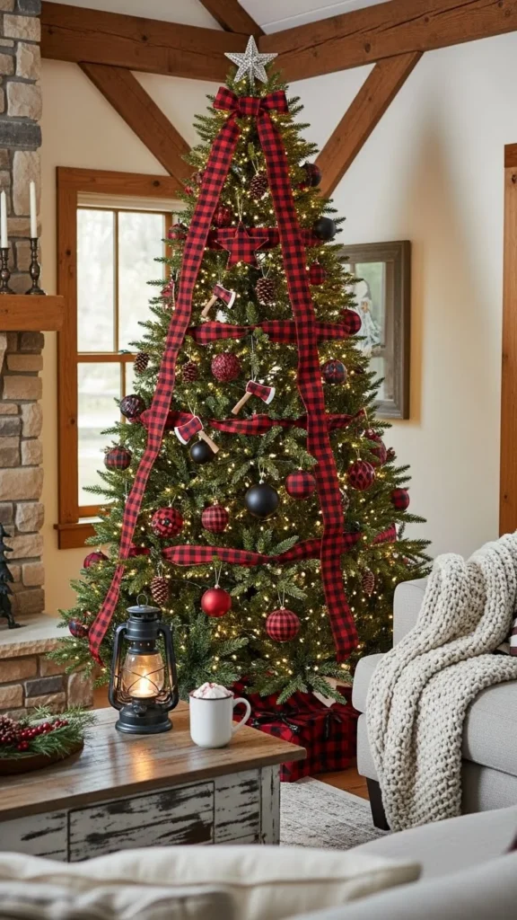 Plaid is a classic farmhouse pattern, and it works beautifully on a rustic tree. Choose buffalo check ribbon or flannel-style fabric strips. Wrap them loosely around the tree or tie them into bows. Add matte black or red ornaments to keep the look simple. Wood stars and pinecones help tone down the bold pattern so the tree still feels natural. This idea adds warmth and colour without feeling too busy. It’s great for families because the pattern feels homely and cheerful. It’s also budget-friendly since fabric remnants work just as well as ribbon.