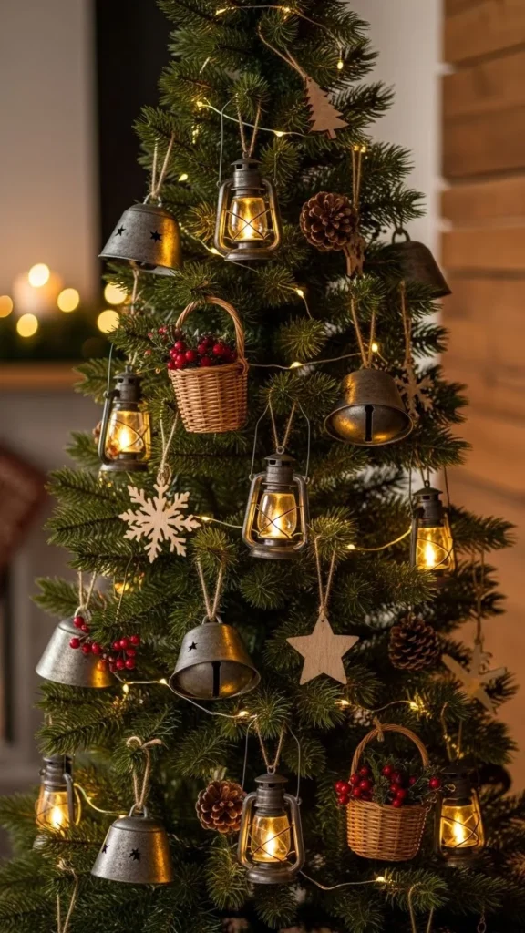 Give your tree character by adding mini versions of old farmhouse items. Look for tiny lanterns, metal bells, or miniature baskets. Many craft stores sell them cheaply. These pieces bring charm without needing fancy decorations. Balance them with natural items like pine sprigs and wood ornaments. Use twine to tie everything in place so the tree stays cohesive. This idea works especially well if you enjoy vintage shopping or want something with a nostalgic mood.