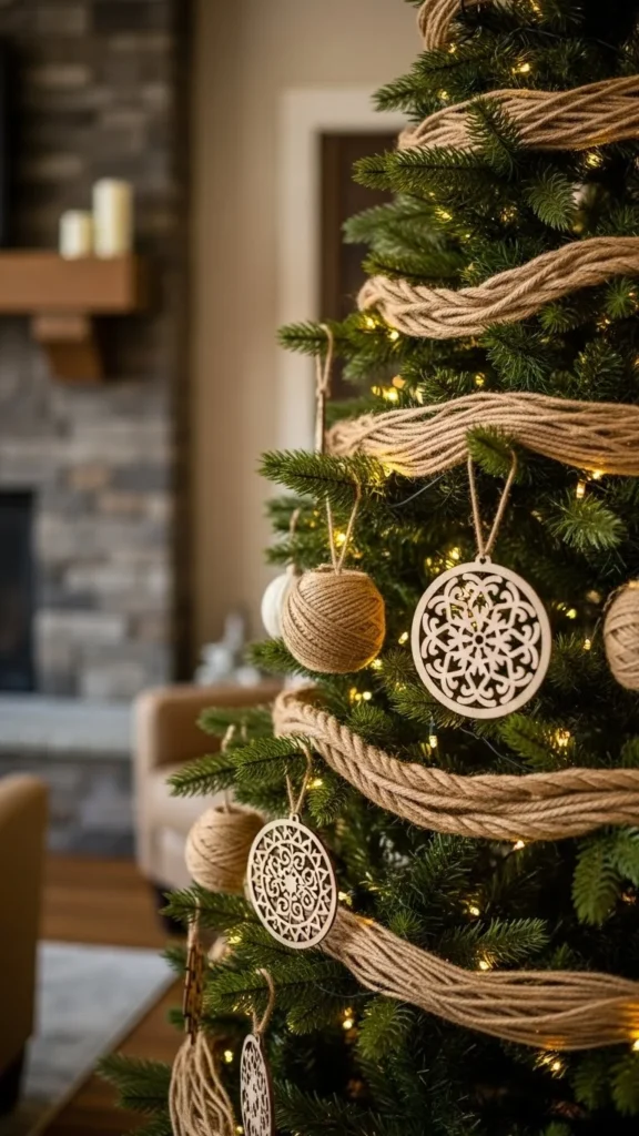Twine gives any tree a handmade look. Use thick rope for a chunky garland or thin twine for smaller accents. Add tiny bows of jute or natural fabric. Mix in wood ornaments and plain baubles for colour balance. This idea is perfect for anyone who enjoys simple, earthy decor. You can even wrap twine around plain plastic ornaments to make them look handmade. It’s low-cost and easy, making it great for busy households or last-minute decorating.