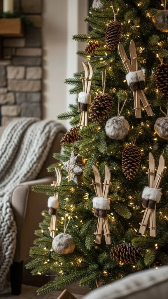 If you love cabin style, decorate with small wooden skis, faux fur pieces, and wood stars. Keep the colours natural: brown, cream, and muted green. Add warm lights for a cosy glow. Place a plaid blanket around the base instead of a traditional skirt. This gives the tree a snug cabin mood without much effort. Many of these items are easy to DIY or find at low prices.