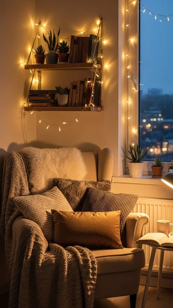 String lights are a simple way to bring holiday magic into a small apartment without taking up floor space. Drape them along a window, around a shelf, or across a headboard. Warm white lights work well because they add a soft glow without looking busy.