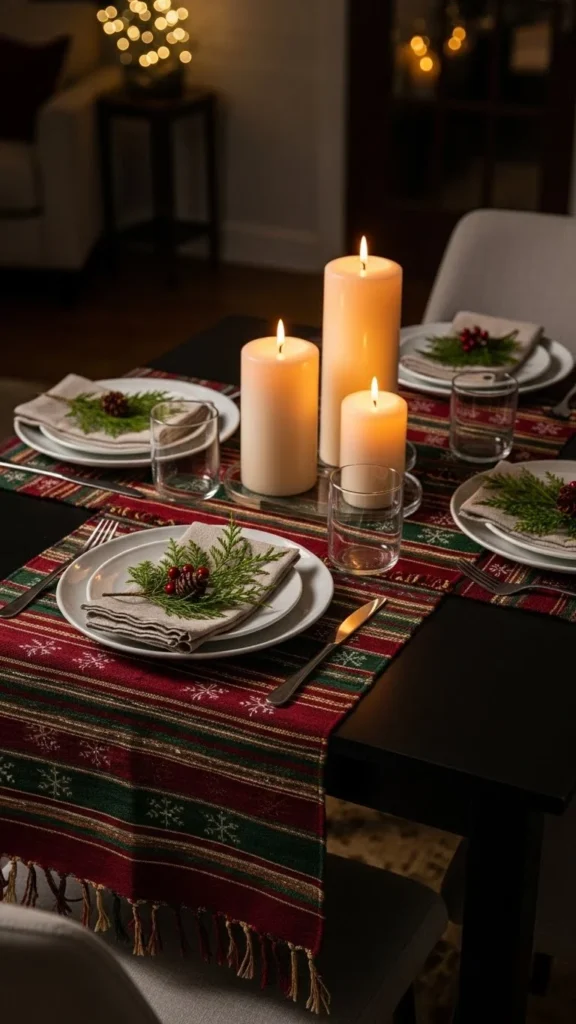 A table runner adds holiday style without the bulk of a full tablecloth. It’s perfect for small dining tables or kitchen islands. Pick a pattern like plaid, pine branches, or soft neutrals.