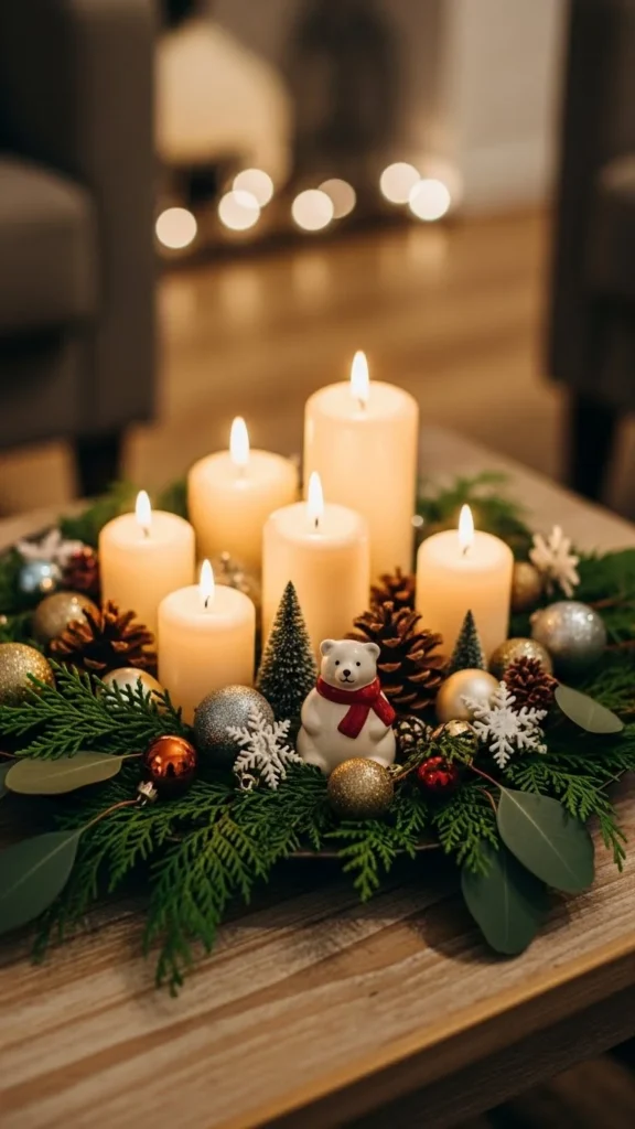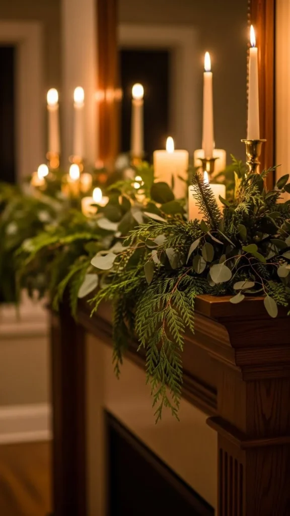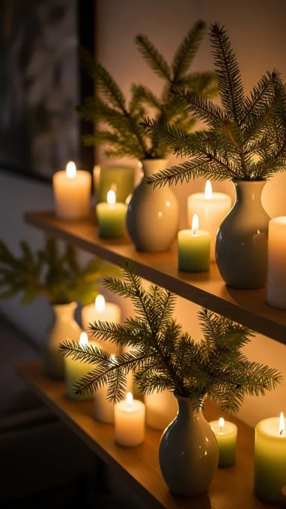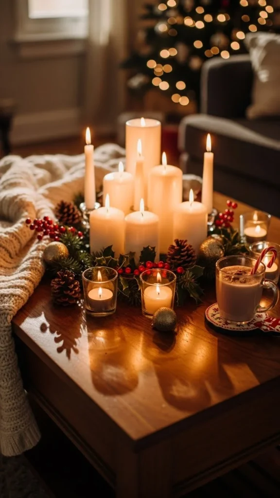 Choose warm scents like cinnamon, vanilla, pine, or amber to bring in a festive feel. For a safer option, use LED candles—they offer the same glow without heat. Add a few evergreen sprigs or ornament pieces around the base to create a quick holiday vignette. You can also group candles near a mirror to reflect more light and make the area feel bigger. This creates a gentle, welcoming atmosphere perfect for evenings indoors.