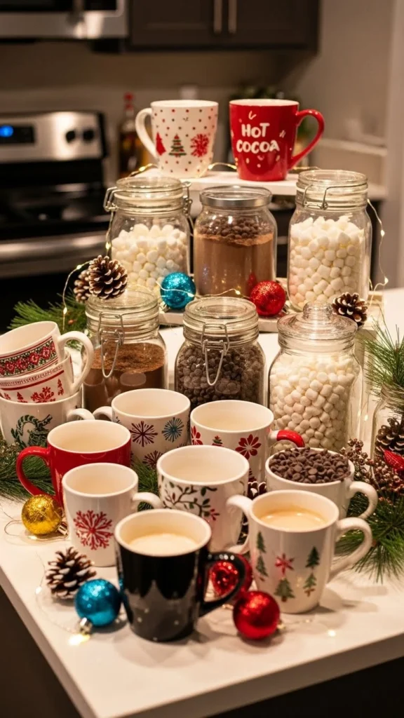 A mini hot cocoa station adds holiday cheer and makes your kitchen feel lively. Use a small tray or cart and place mugs, cocoa mix, marshmallows, and a few festive accents.