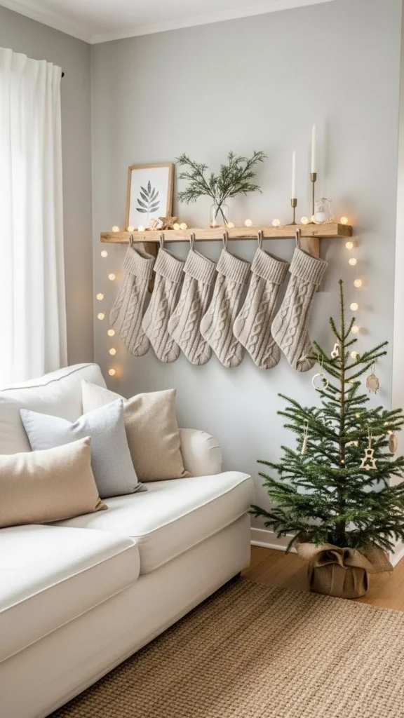 Neutral décor keeps your small apartment looking calm while still feeling festive. Use beige stockings, wooden ornaments, and simple greenery.