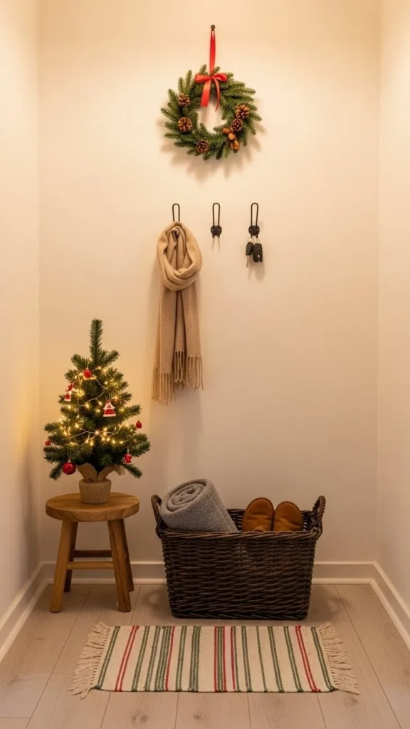 Keep decorations minimal so the space stays functional. Add a holiday basket for gloves or scarves. This creates a warm welcome without needing lots of décor. It’s also an easy area to update each season with only a few items.