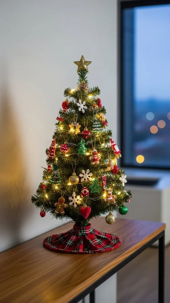 Use mini ornaments to keep the look balanced. If you want a unified look, stick to two or three colours like gold, white, and green. A small tree skirt or a simple piece of fabric can finish the base. If you’re on a budget, use items you already have, like ribbon, tiny bells, or dried orange slices as ornaments. This setup keeps your apartment tidy while still giving you a central holiday decoration. You can even add small battery-powered lights for a gentle glow.