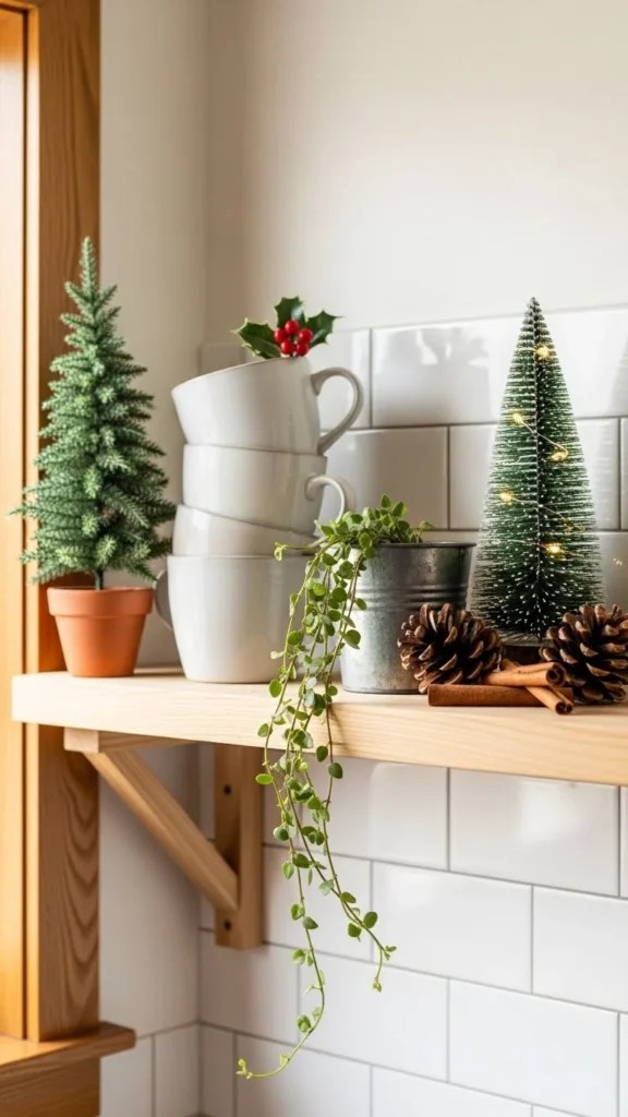 Open kitchen shelves are perfect for small holiday touches. Add a few festive mugs, small trees, or simple greenery.