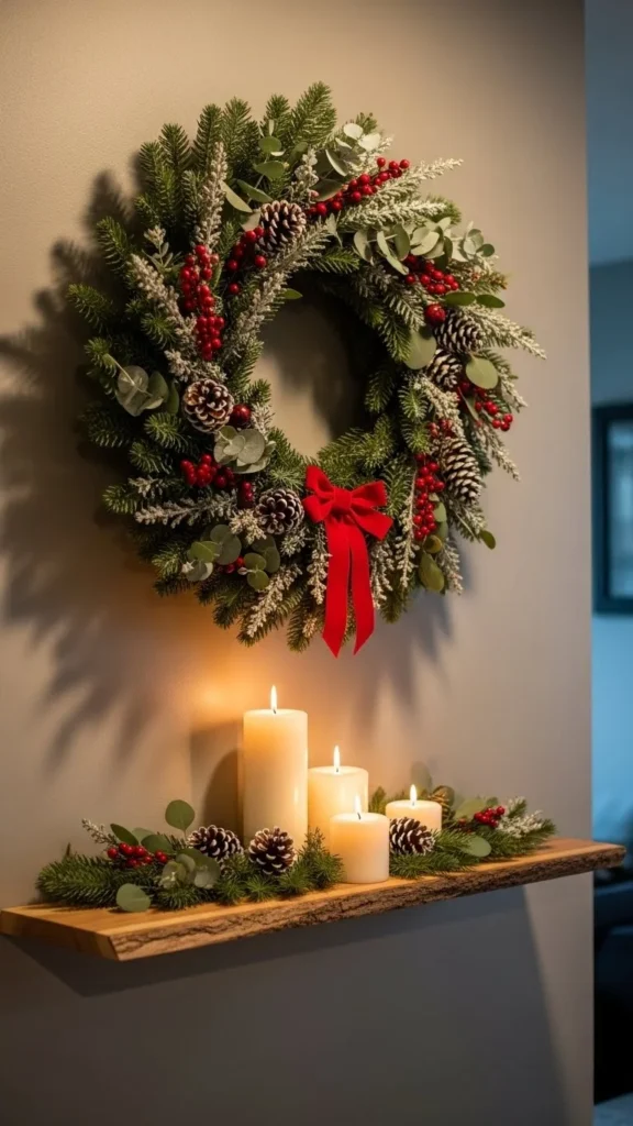 You can choose a classic pine wreath or something simple like eucalyptus. To make an affordable version, buy a plain wreath and add ribbon, berries, or ornaments. Lightweight command hooks make hanging easy without damaging walls. If your apartment is small, choose a medium-size wreath so it doesn’t overwhelm the space. This simple addition gives your home a holiday focal point without clutter.