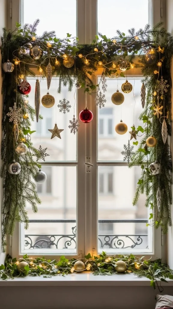 Windows offer free space for holiday décor. Hang lightweight ornaments on clear fishing line to create a floating effect. Add a strand of lights around the frame for a cosy glow.