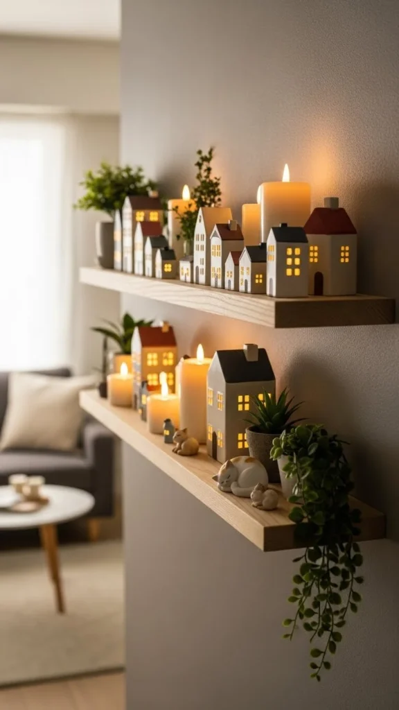 Keep the look tidy by sticking to a simple colour palette. If you want a budget option, paint small wooden houses or repurpose items from last year. Add warm lights or tiny string lights for a cosy effect. This setup keeps everything up and out of the way, leaving your main surfaces clear. It adds height and festive charm without crowding your space.