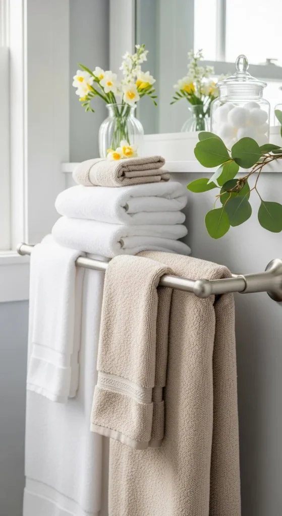 Soft hand towels feel welcoming. Choose light colors that match the rest of the bathroom.