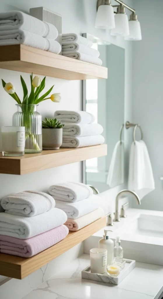 Open shelves should feel uncluttered. Use folded towels, one plant, and one small decor item.
