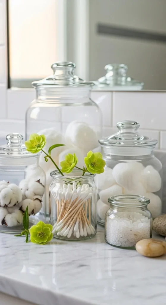 Clear jars feel clean and simple. Use them for small bathroom items.
