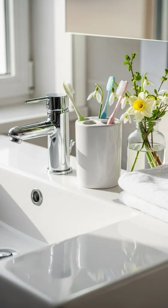Keep only essentials like soap and a toothbrush holder. Open surfaces help the room feel calm and easy to clean.