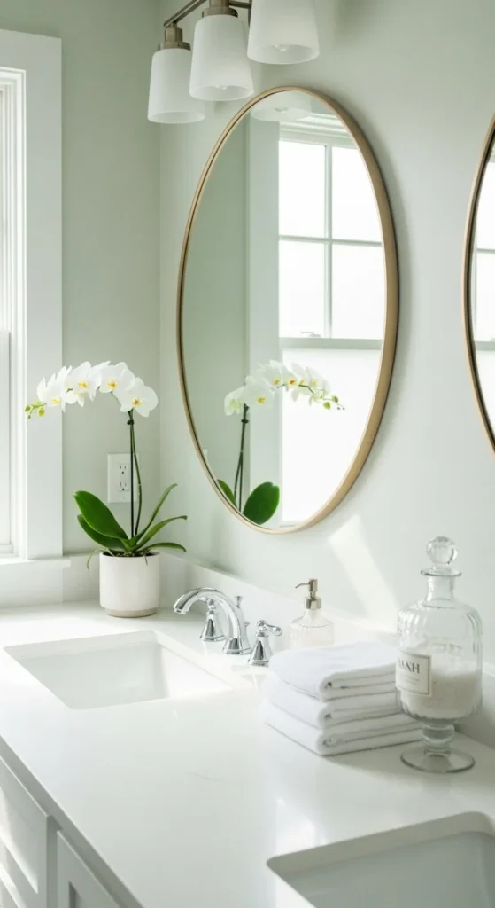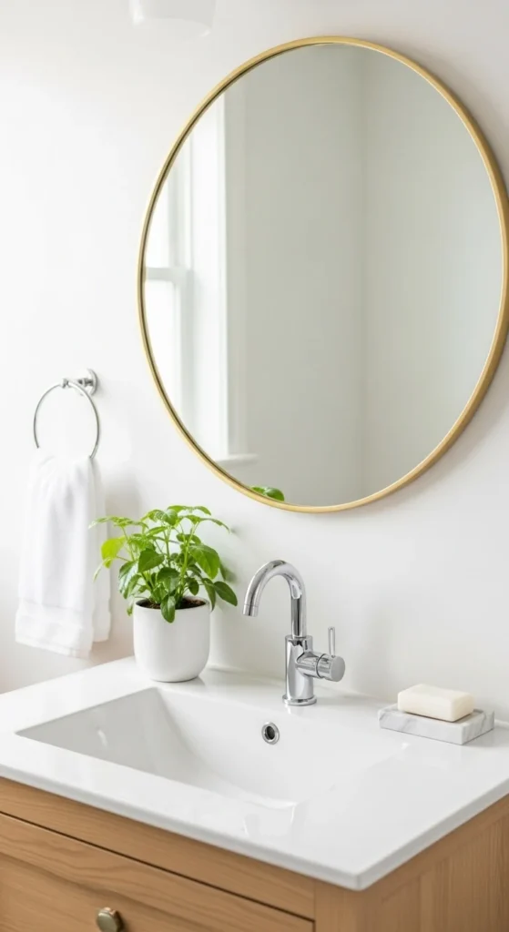 Use one small decor piece near the mirror if needed. Less clutter keeps focus on light.
