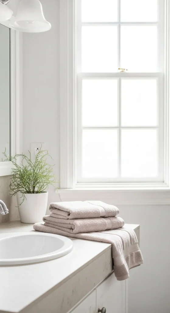 Dark towels can make a bathroom feel heavy. Replace them with white, cream, or soft pastel towels. Light colors reflect more light and look cleaner.