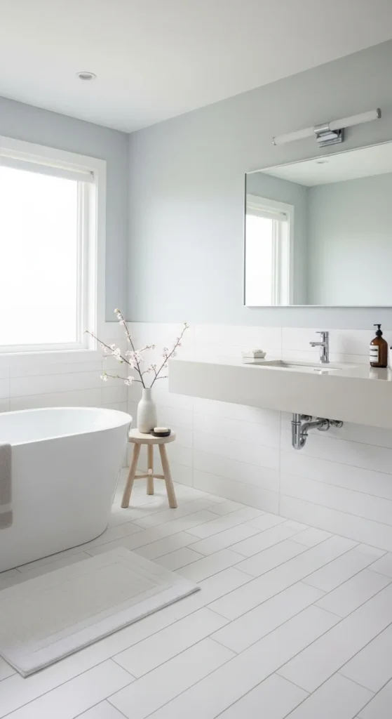 Light colors make bathrooms feel larger. Whites, creams, and soft grays work well.