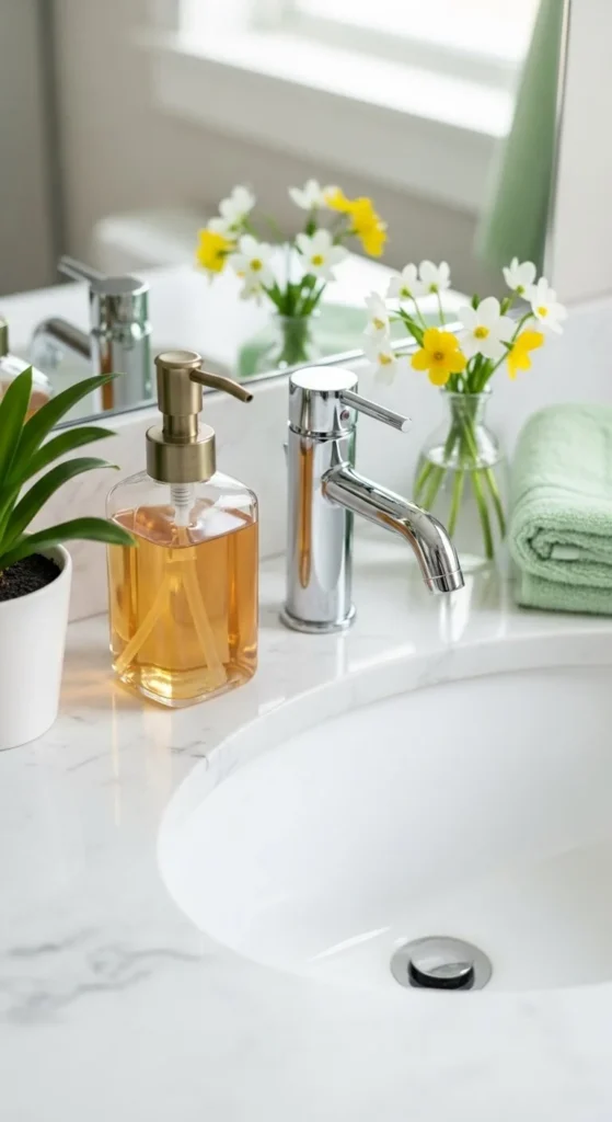 Plastic bottles can look cluttered. Switch to clear or glass soap dispensers. They feel cleaner and more organized.