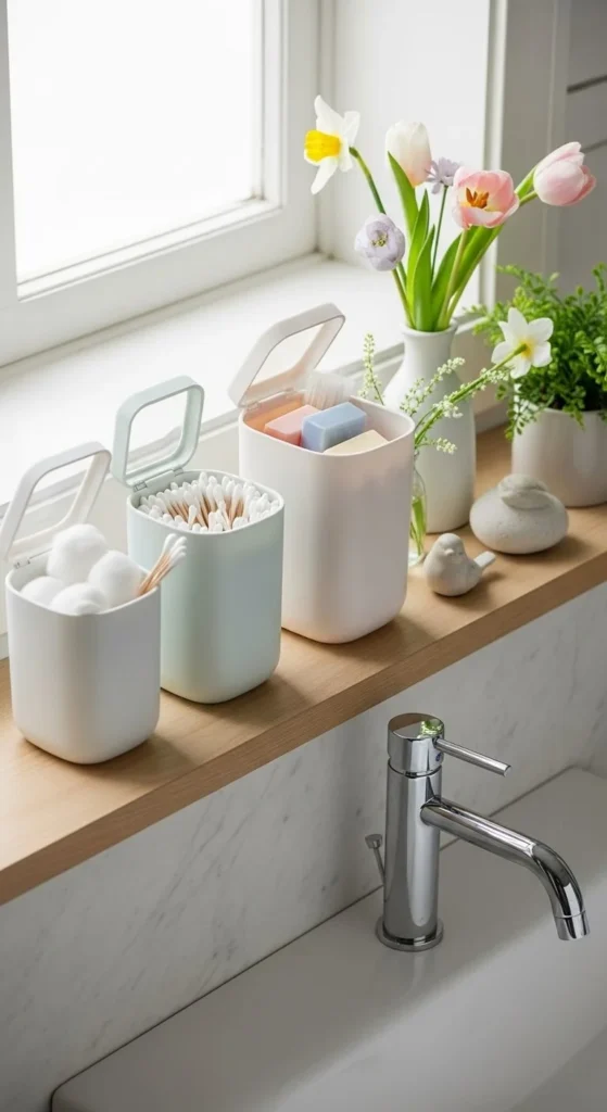 Matching containers make storage look tidy. Use them for cotton pads, soap bars, or small items.