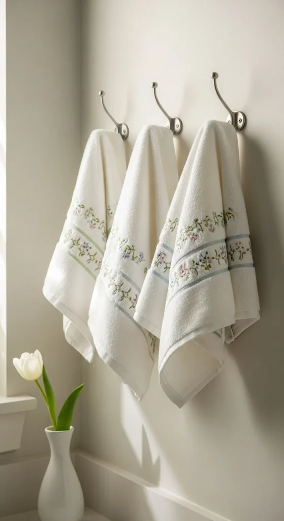 Choose hooks in light finishes like white or brushed metal. This keeps the look simple and neat.