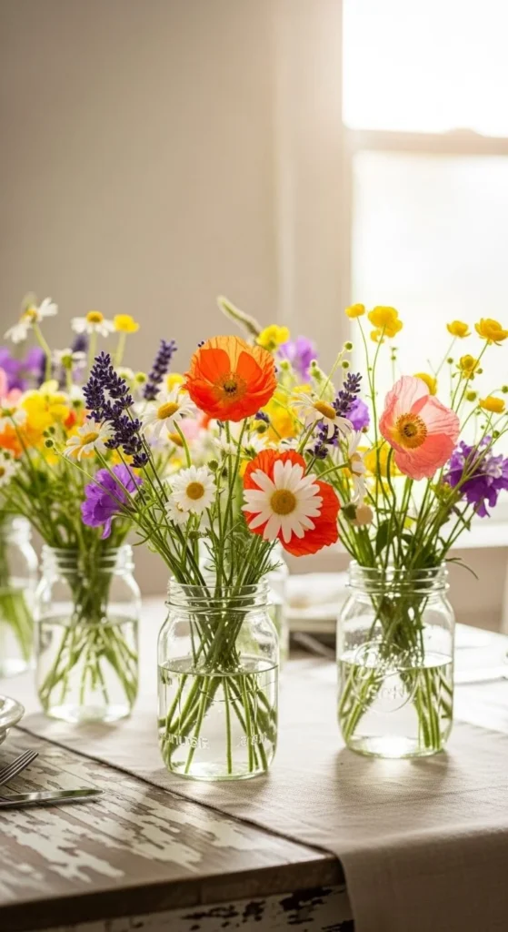 Group three or five mason jars down the center of the table. Use different heights by trimming stems unevenly. Fill each jar with common wildflowers or grocery-store blooms. This works well because it feels relaxed, not styled. Tie twine or ribbon around the jars if you want detail without cost. For a tighter budget, use greenery from your yard. Keep water levels low to avoid spills. This setup fits daily meals and casual guests.