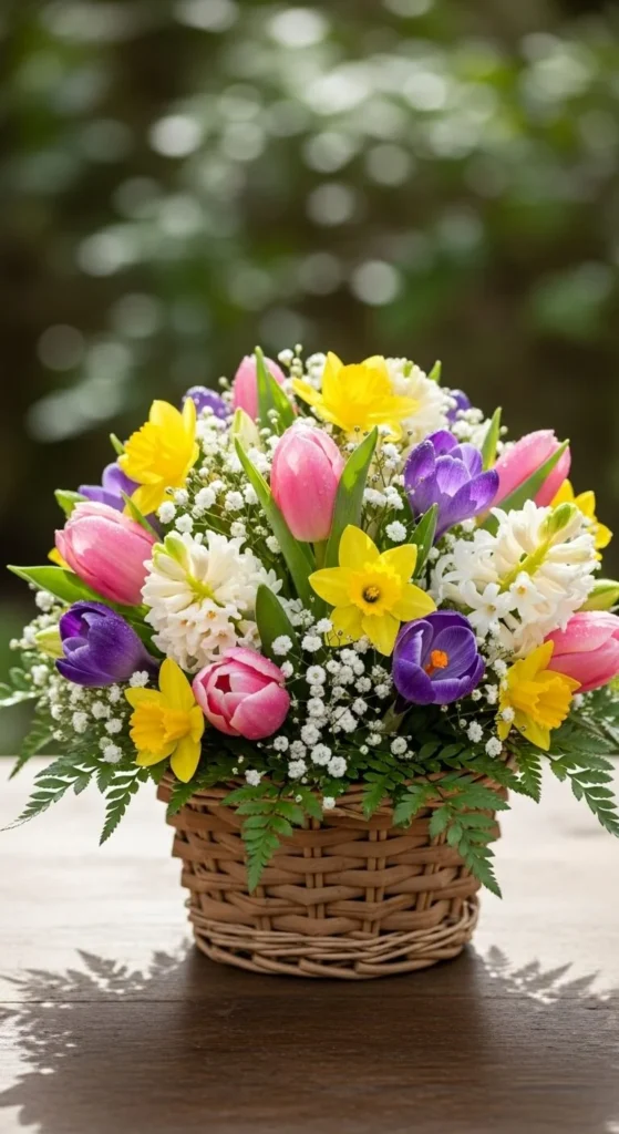 Use a shallow basket with floral foam inside. Insert short stems tightly. This keeps things neat. Choose soft colors for a gentle look. It’s easy to move and reuse.