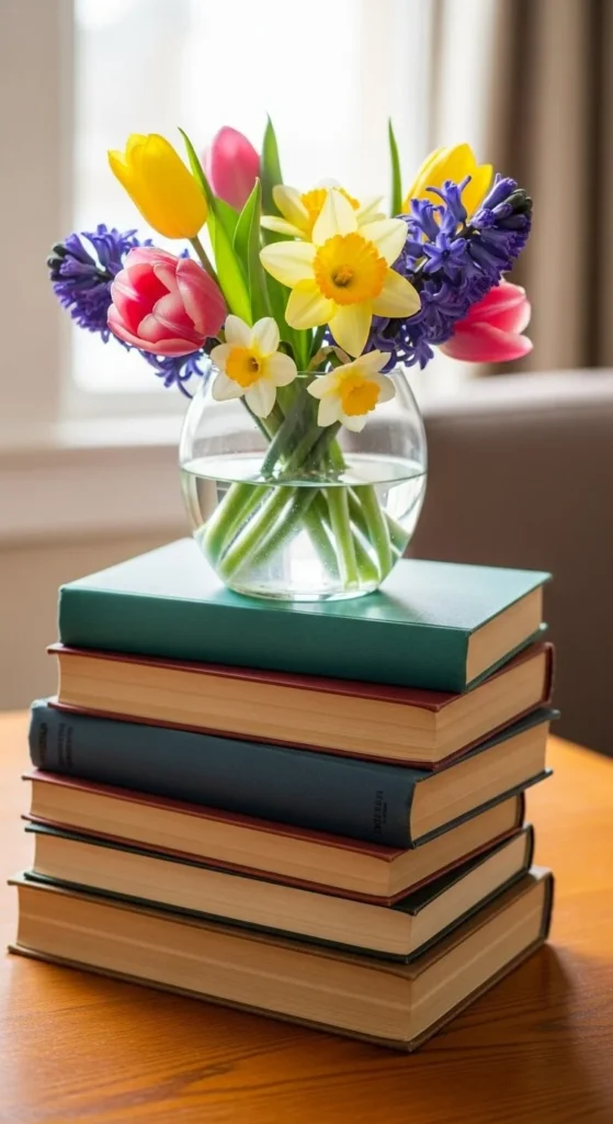 Stack two or three neutral books. Place a small vase on top. This adds height and texture. It’s a good option if you already have flowers but want more presence.