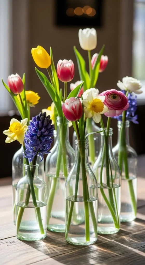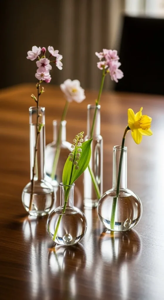 Place several tiny vases across the table. Each holds one stem. This spreads color without clutter. Thrift stores often have these cheap. Stick to one flower type for unity.