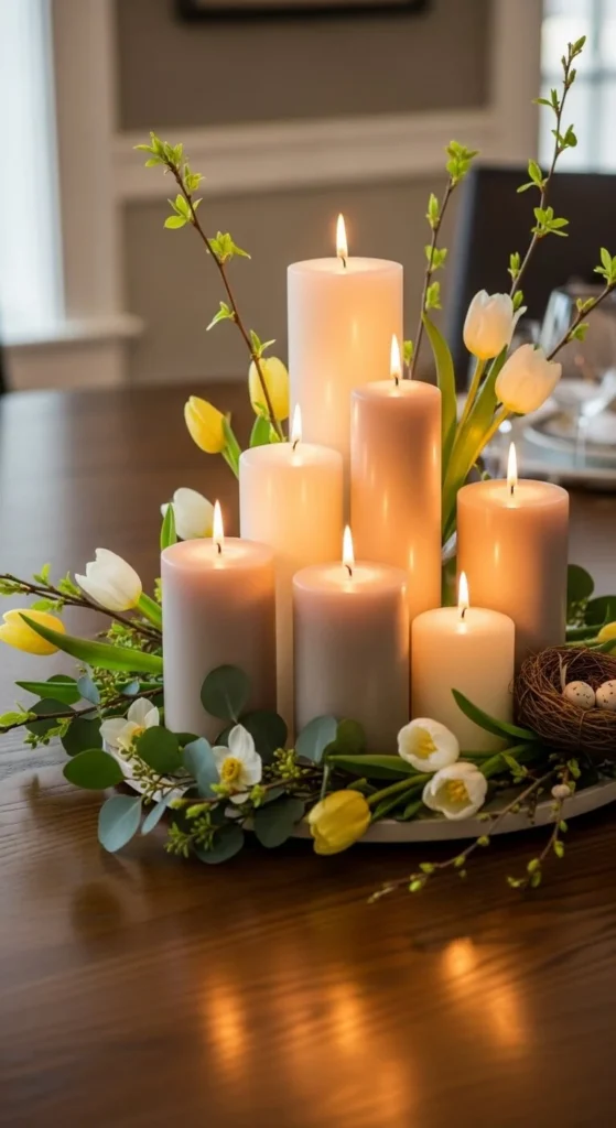 Group candles of different heights. Keep colors soft. Add a small greenery ring around the base. Candles add warmth even when unlit.