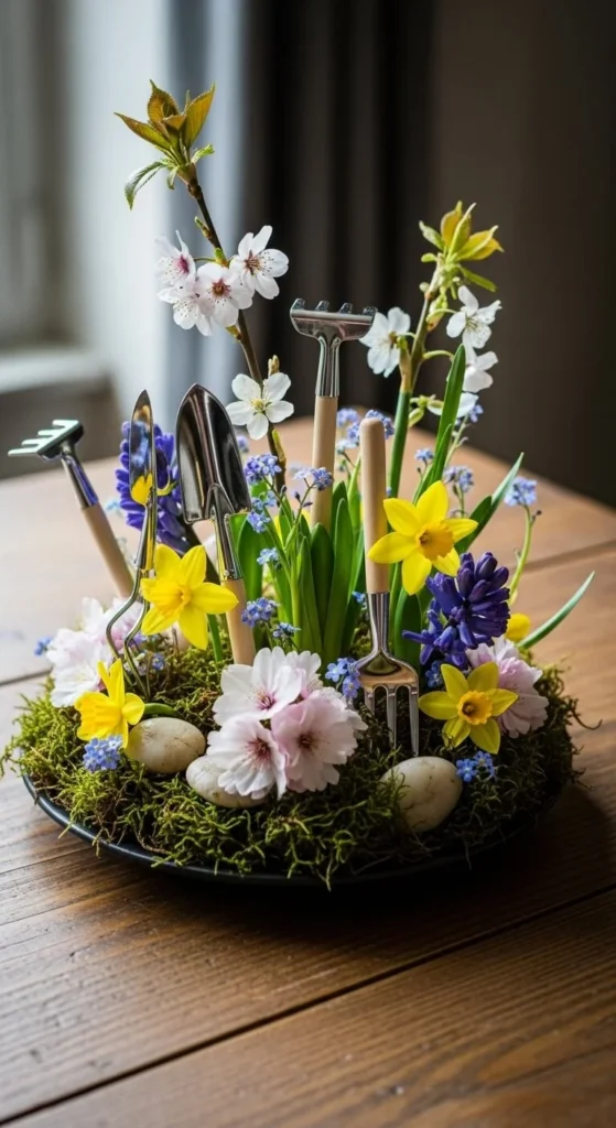 Add a small hand shovel or watering can beside flowers. Keep it subtle. This suits casual spring gatherings and outdoor meals.