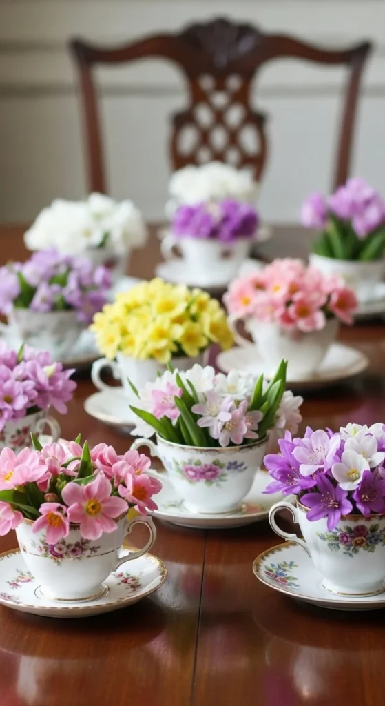 Fill teacups with short stems. Group them loosely. Mismatched cups add charm without effort.