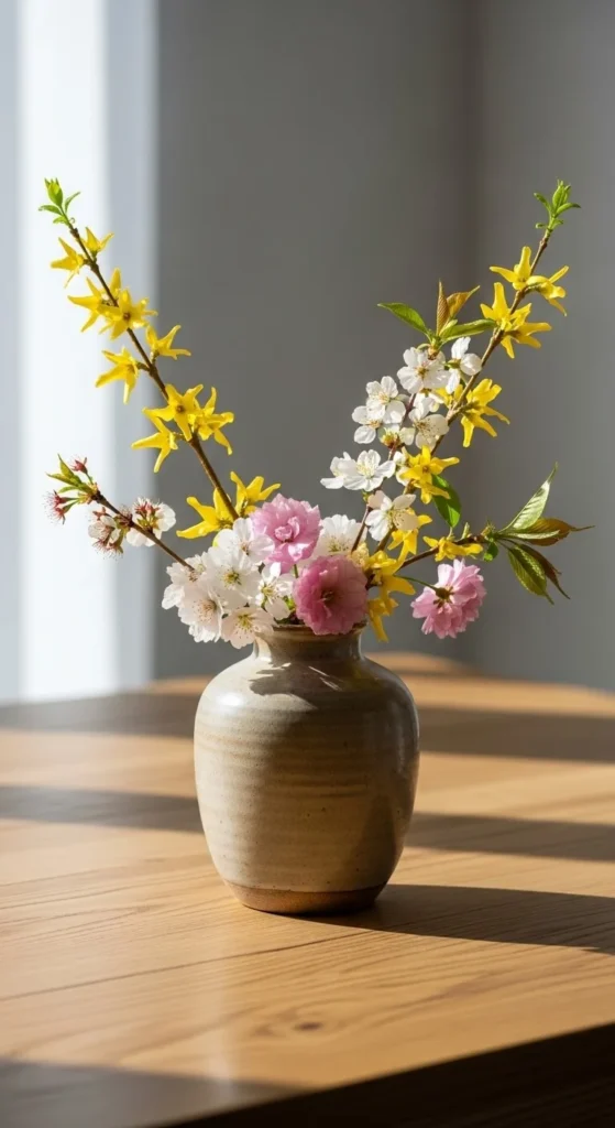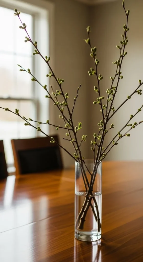 Cut budding branches from outside. Use a tall vase. Let the branches spread naturally. This adds height without flowers. It works well for entry tables or large dining rooms.