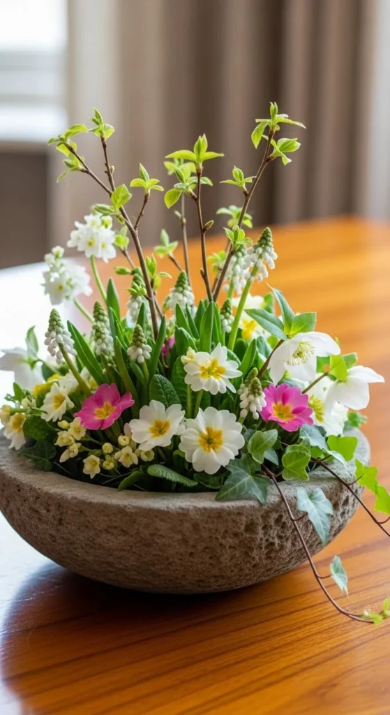 Fill a stone or concrete bowl with greenery. Add a few blooms. The weight keeps it steady and grounded.
