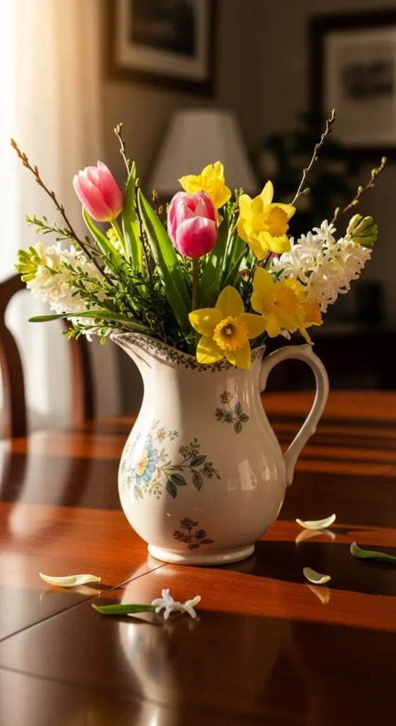 A chipped or old pitcher adds charm fast. Fill it with loose stems, not tight bunches. Let some flowers lean outward. This keeps it casual. If flowers feel pricey, mix in greenery. Place it slightly off-center for a relaxed look.