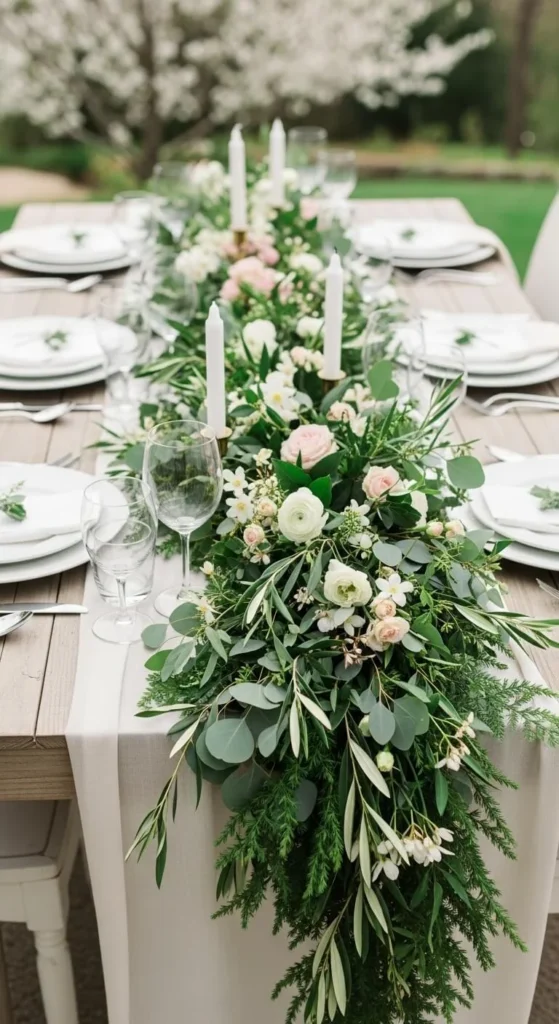 Lay eucalyptus or faux greenery straight down the table. Keep it low so guests can talk easily. Add a few candles between sections. This idea works well for long tables. Faux garlands save money and store easily.