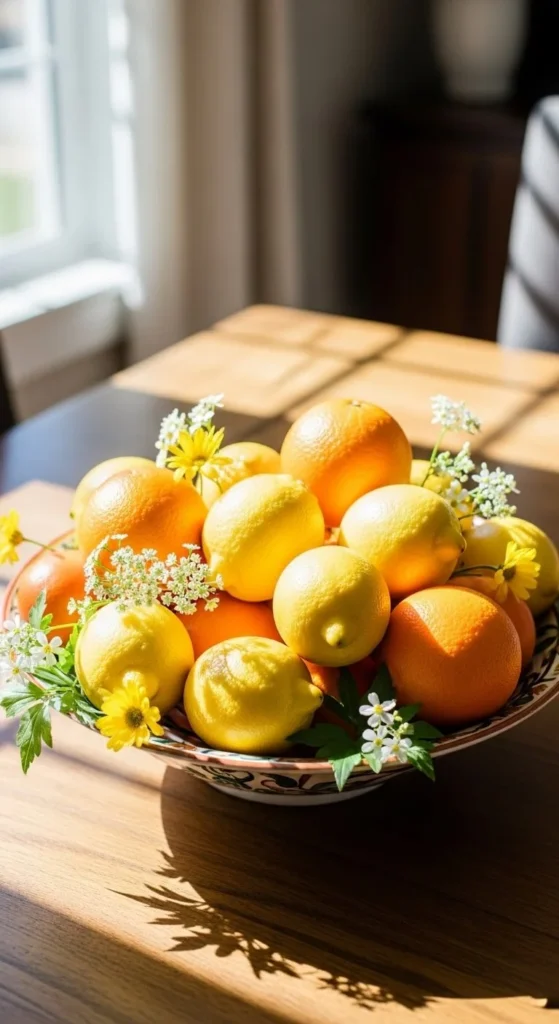 Fill a shallow bowl with lemons or oranges. The color feels lively and clean. You can mix with greenery underneath. When the meal ends, the fruit can be used later. This idea costs little and feels practical.