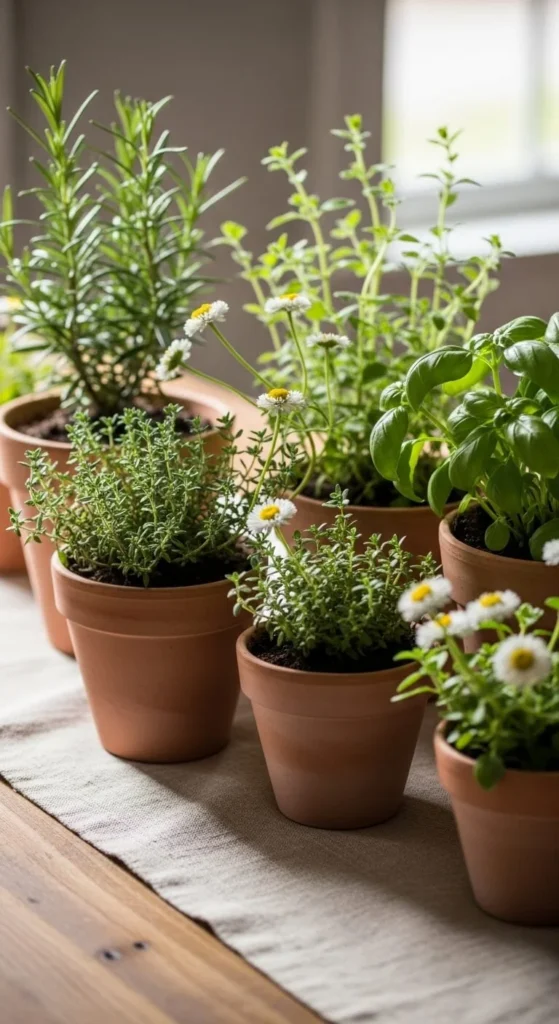 Use basil, mint, or rosemary in small pots. Line them in the center. Guests enjoy the scent. Afterward, move them to the kitchen window. Choose plain clay pots or wrap them with paper for a softer look.