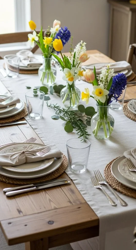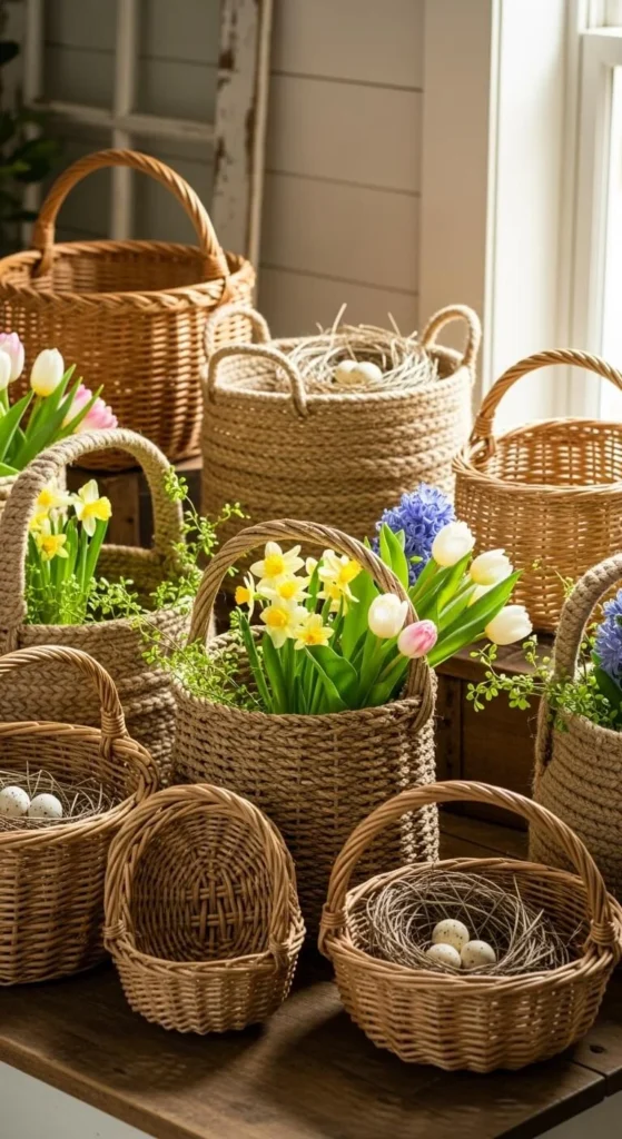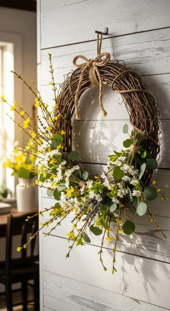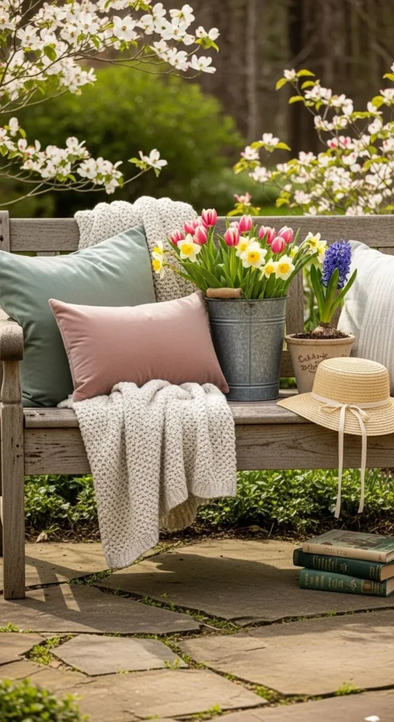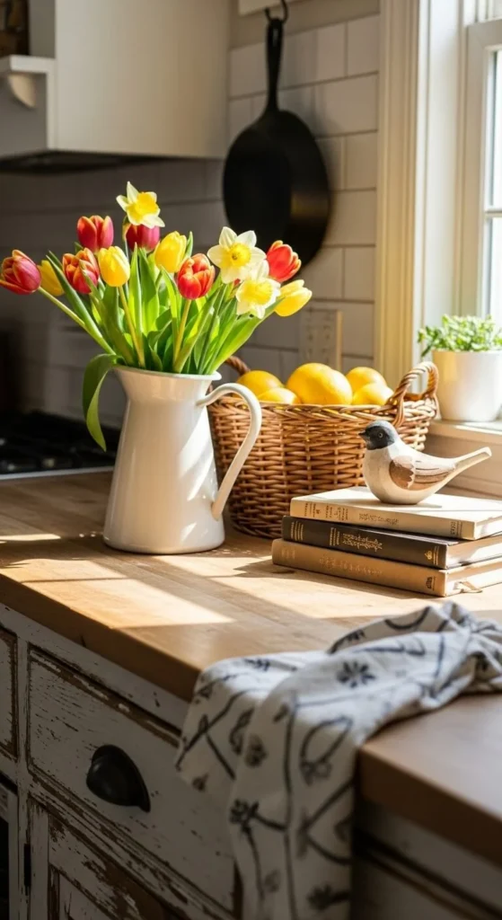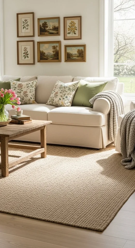 Let wood and neutral tones lead. Add spring touches lightly. This keeps the space warm and seasonal without clutter.